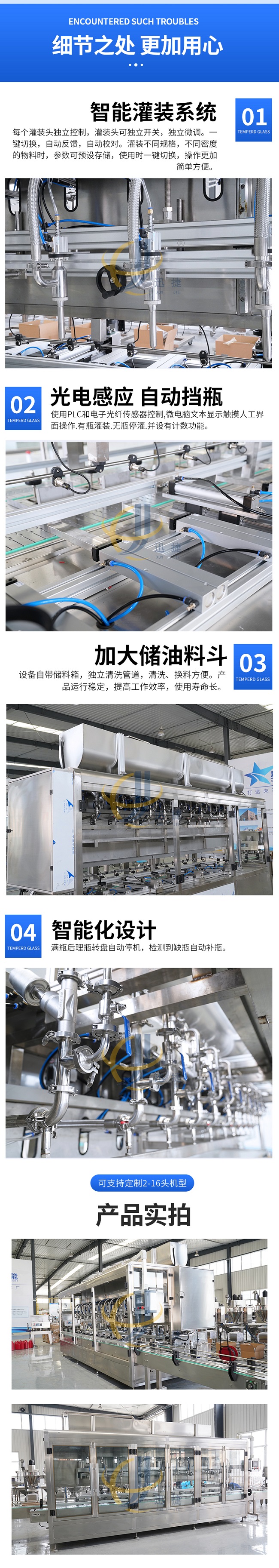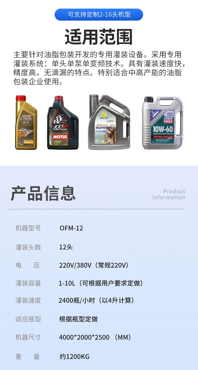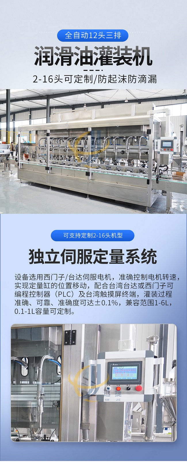 這款全自動十二頭三排潤滑油灌裝機是本公司專為潤滑油廠家研發的自動化設備,這款潤滑油灌裝機2-16頭可定制,防起沫防滴漏。主要針對油脂包裝開發的專用灌裝設備。采用專用灌裝系統:單頭單泵單變頻技術。具有灌裝速度快,精度高,無滴漏的特點。特別適合中高產能的油脂包裝企業使用。