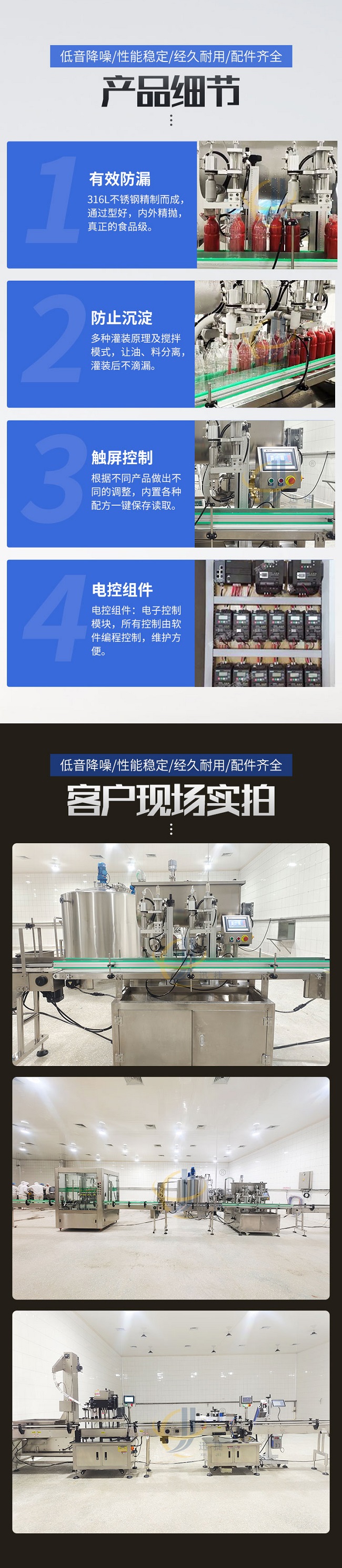 這款柱塞式辣椒醬灌裝機低音降噪、性能穩定、經久耐用、配件齊全,適用范圍廣泛用于辣椒醬、拌面醬、豆瓣醬、大塊肉醬、油辣醬、番茄醬花生醬、草莓醬等醬料的定量充填分裝。雙螺旋變頻攪拌,有效防止物料沉淀造成的計量不準。物料通過三通轉向閥連接攪拌料箱,攪拌料箱里配置變頻攪拌系統,攪拌系統讓物料在極低破壞率的情況下,得到充分的攪拌。